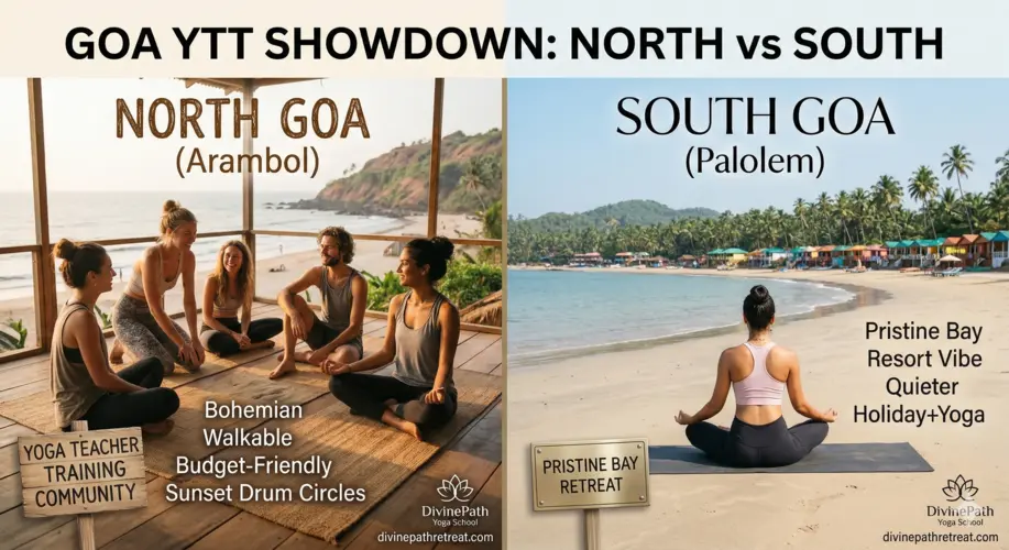 North Goa is better for yoga teacher training. Specifically, Arambol in North Goa has the highest concentration of Yoga Alliance-certified schools, the lowest living costs, the strongest yoga student community, and the best infrastructure for international students. DivinePath’s Goa campus is in Arambol, where the 200-hour YTT starts at $899 for a shared cottage.